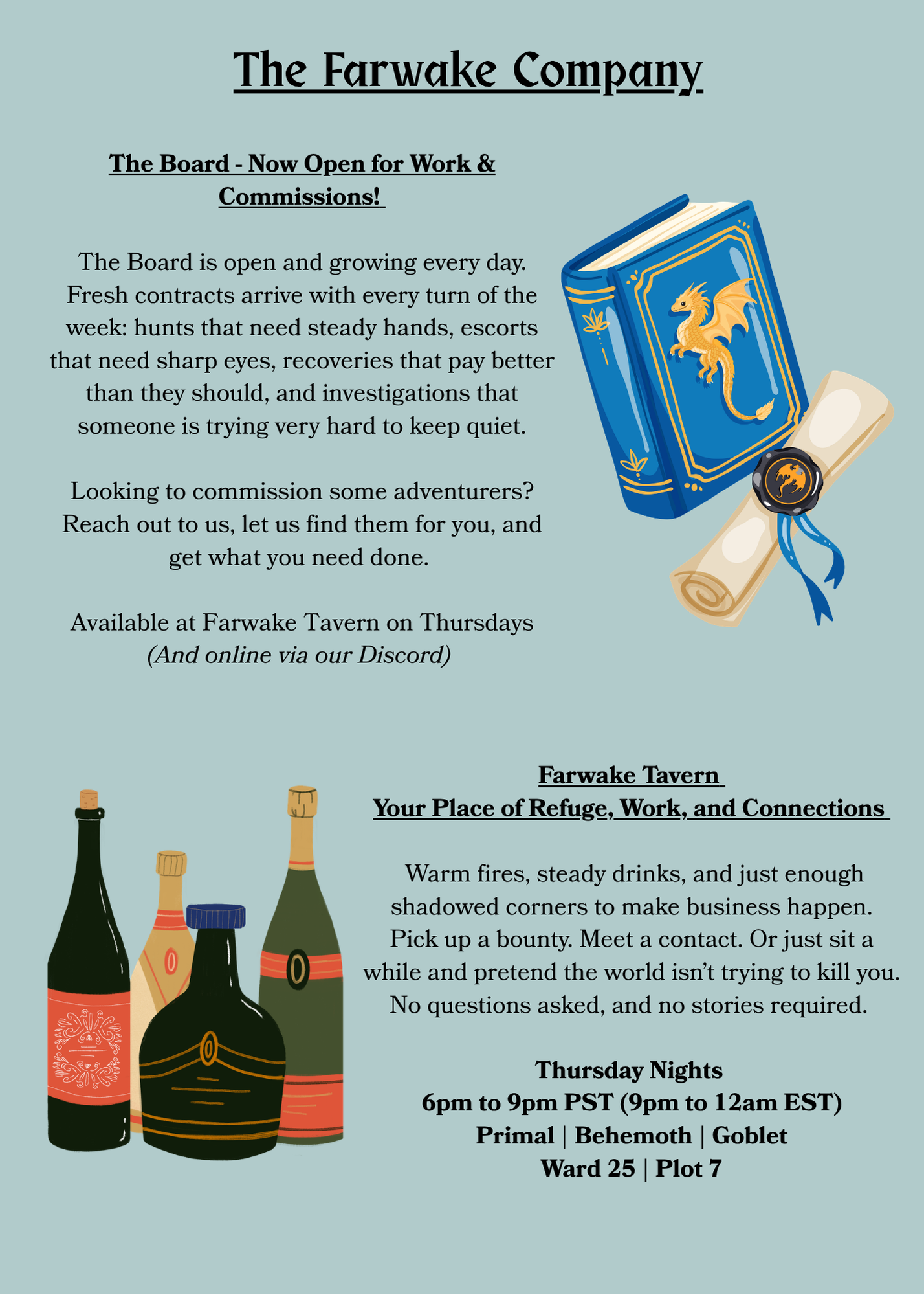 The Farwake Trading Company is a Heavy RP-focused branch of the Stormslayer Roleplaying Community designed for players who want to explore morally grey, higher-stakes, and more supernatural-leaning storylines.While Stormslayer remains the “clean” face of trade that is community-driven, artisan-focused, and broadly approachable, Farwake exists to tell the kinds of stories that don’t neatly fit into that space.Farwake is not separate in the community; it’s an extension of what already exists. Players can interact with both sides, Stormslayer and Farwake, use different characters, or explore different facets of the same character, depending on the story being told. The goal is to expand roleplay opportunities, not divide them.